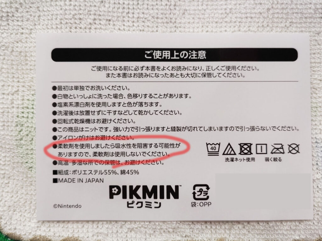 ところでハンドタオルの注意書きに気になる表記。