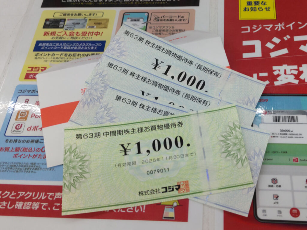 コジマ(7513)は店頭で使えるお買い物券がいただけます。以前にも書いたと思うのですが、有効期限は半年と短いもののギリギリのタイミングだと1年分をまとめて使えます。
